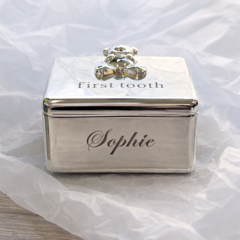 Prachtig, verzilverd doosje om de eerste tandjes in op te bergen.